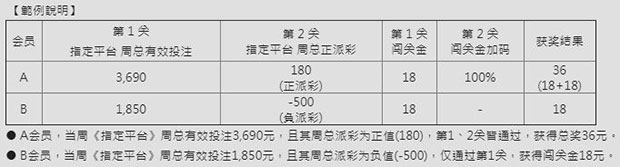 活动期间,会员于每周一中午12点至隔周一中午12点为单周结算区间,于指定平台进行投注,依各关闯条件及门槛